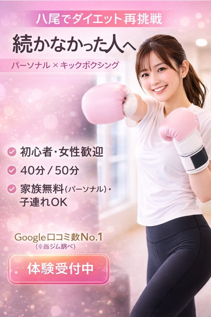一般的なパーソナルジム(筋トレのみ)に比べ、キックボクシングは有酸素運動の要素が入るため、消費カロリーが非常に高く、短期間でのダイエット効果が期待できます。「筋トレだけでは続かなかった」という八尾エリアの女性の方に多く選ばれています。